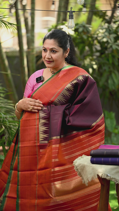 An Ettukol (a tradtional weaving technique) Kanjivaram in a beautiful dark brown body with Orange and brown border. The Pallu has Seepu Rekhu designs in Zari along with Zari Lines. The blouse is in same shade and retains the border design. A traditional color combination suitable for any fuctions and temple visits.