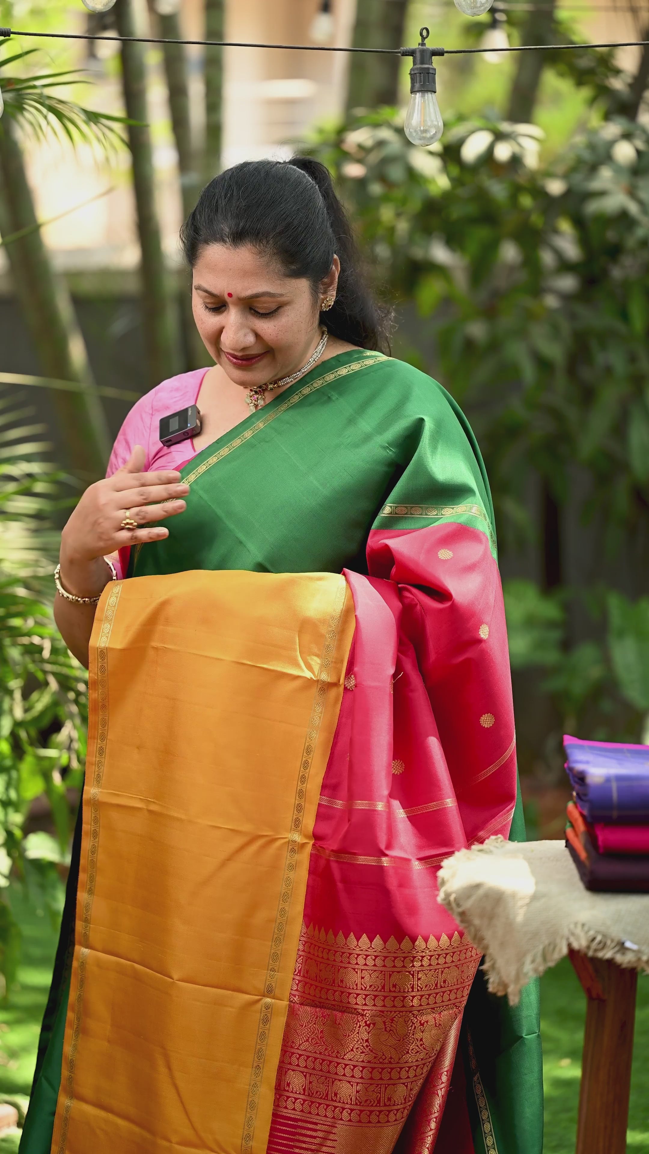 A long border Kanjivaram silk saree with Yellow border on the bottom and the green border on the top. Body is in arakku Red shade. The blouse retains the same color combination. The Pallu has grand Zari work. A great choice for any celebrations.